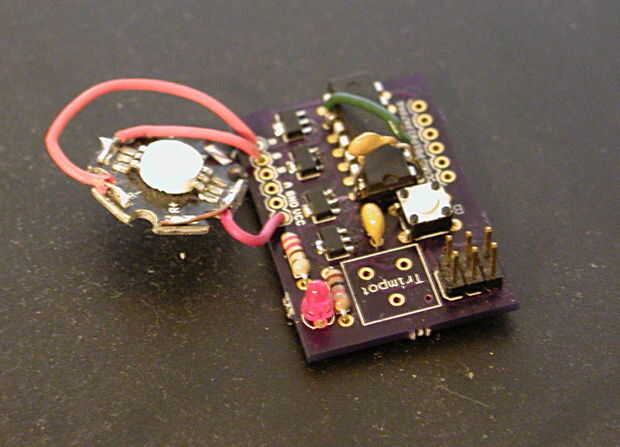 De hecho, aprovechó un Consejo que he estado trabajando en esto; tiene un ATtiny84, un jefe de programación ICSP y cuatro drivers de corriente constante de LC135. Estos últimos son un chip poco cool suministrará un regulado 350 miliamperios a un LED de alta potencia, tendrá PWM y apilado (o, más bien, ejecutar en paralelo).