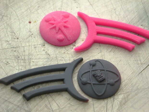 Los donuts y la célula de energía fueron impresos en TechShop en PLA rosa, limpiaron y cubrió de brillo sin pintura. Los detalles secundarios también fueron impresos por mí, pero ésos consiguieron la misma pintura de cromo en las otras partes. Esto fue parte de la filosofía "que se vea real", así como facilitar la arena plana a los lados de la pistola; en lugar de pegar luego la pintura, se realizaron intencionalmente para tener una costura visible entre pistola y destellos.