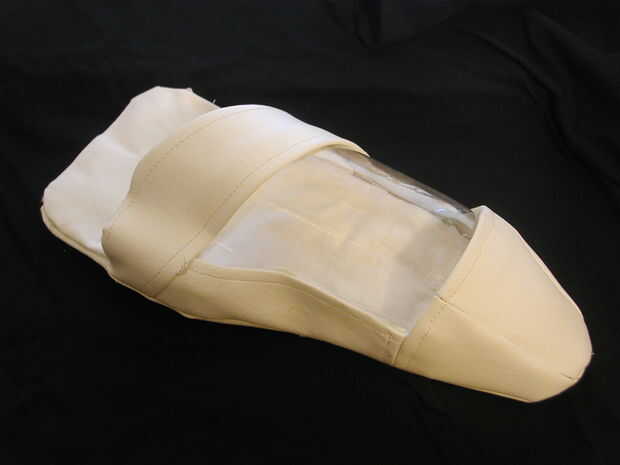 Entonces mi Bernina 830 y luchó durante casi dos días para hacer un trabajo prolijo de tirar blanco piel artificial alrededor de la cosa. Si el tiempo hubiera sido más estricto, habría sólo utilicé pegamento caliente. Como era, algunos de los puntos decorativos y ocultan una solución de cola caliente, pero la tela es realmente costuras para colgar alrededor de la forma.