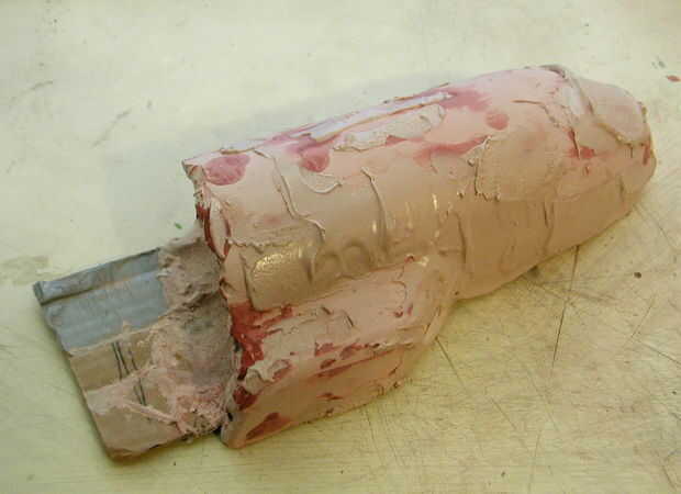 Este es un método muy rápido. El defecto importante es ya que trabaja la dimensión deseada de la salida, el punto final será mayor de lo deseado. Un mejor enfoque es reforzar la parte exterior de la cáscara de la referencia (cinta, pepakura o lo que sea) entonces llene con yeso (o mejor aún hydrocal, que hace mejor en el vacío que forma la máquina). Esto te hace maestro más cerca a dimensional.