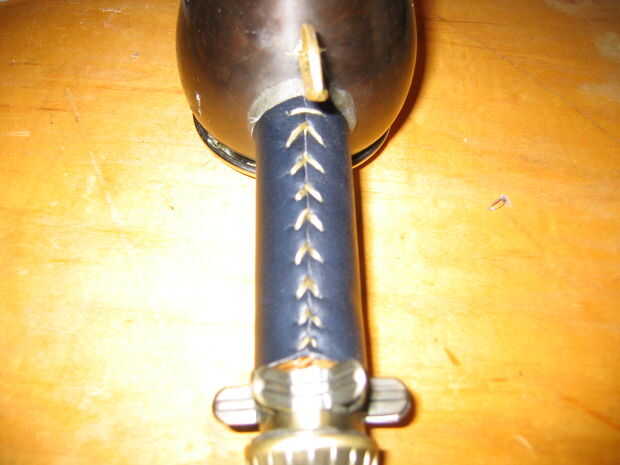 comencé pegando trozos de cinta para hacer una pequeña hoja que no es pegajosa en cualquier lado. He envuelto alrededor de la manija y había marcado hasta hacer un patrón. Usé el patrón y cortar un pedazo de cuero. Luego utilicé la aguja curvada y tendones encerado para permanecer juntos.