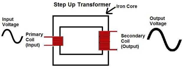Un transformador toma su entrada de energía eléctrica, funciona a través de los cables que están enrollados alrededor de un poste de hierro, esto se llama la bobina primaria. Esta corriente en espiral alrededor de metal un electroimán. En el mismo poste del hierro, hay otro conjunto de bobinas, llamado la bobina secundaria. Porque el hierro ahora es magnetizado por la bobina inferior, hay una corriente "inducida" en la bobina secundaria. Dependiendo del número de veces que las bobinas se envuelven, la tensión de entrada es intensificada o renunció. Porque la bobina más baja tiene menos vueltas que la bobina superior, la tensión se intensificó.
