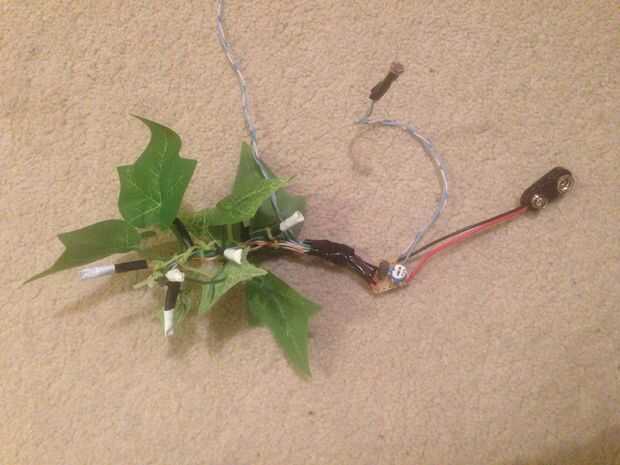 He comprado una guirnalda de hojas de hiedra falso de plástico para cortar. Me sacó varias hojas y atado alrededor de los cables para esconderlos un poco y hacer que se vea como los LEDs aleatoriamente fueron arreglados alrededor de ellos. Esto entonces fue unida a la placa de circuito principal.