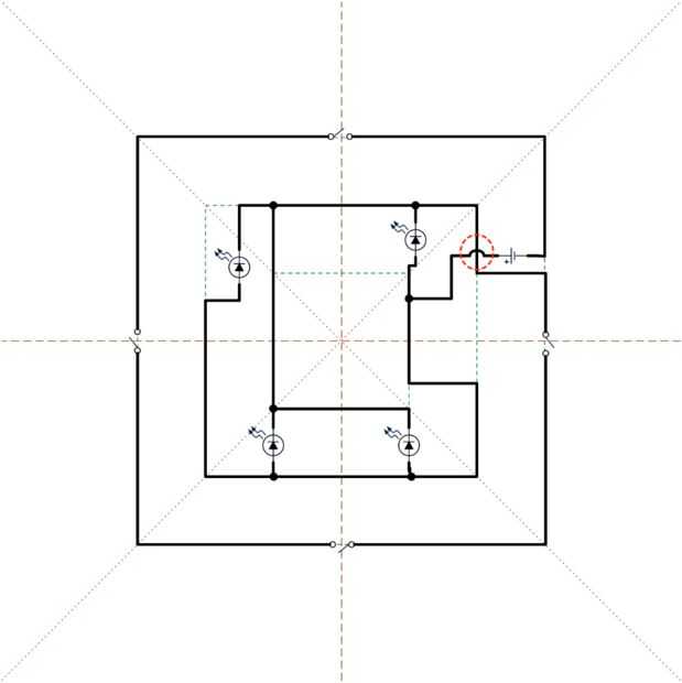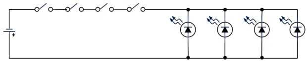 Vamos a pensar sobre el circuito eléctrico que vamos a dibujar en la Paku-paku. La versión simplificada del circuito que estamos haciendo se muestra como en la primera figura. Cuatro interruptores en serie y cuatro LEDs en paralelo. De diseño como este, los LEDs de la Paku-paku se encenderán sólo cuando todas las esquinas cerraron.