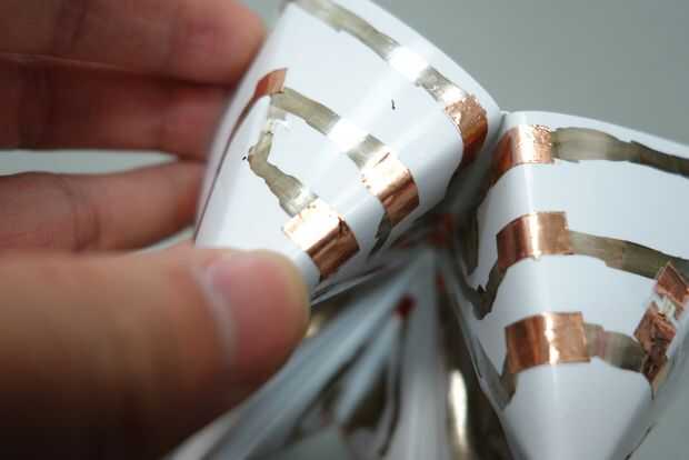 Ahora, tenemos el diseño, así que vamos a dibujar en la Paku-paku con Magic marker. La primera imagen muestra cómo se pueden dibujar las superficies que se pondrá en contacto con ellos. Los interruptores tienen que ser desconectados y tienen que establecerse ampliamente para que el contacto se produce más fácil. Las líneas diseñadas para conectarse tienen que estar conectado. Se puede lograr mediante el uso de alguna cinta de cobre como se muestra en la imagen. También, asegúrese de los pliegues para ser cubierto con la cinta de cobre porque es muy probable que ocurra que el circuito se corta en los pliegues.
