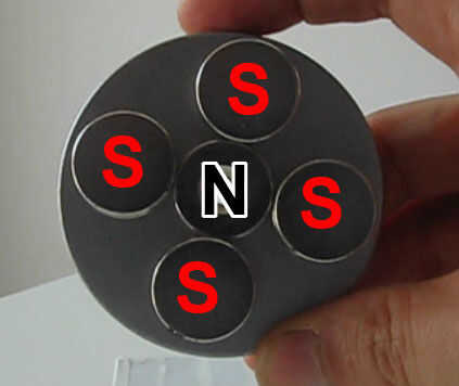 En la base, los imanes colocados alrededor de la varilla, atraen a los imanes que son libres de diapositiva en la barra, pero cuando consiguen también viene de la fuerza repulsiva del imán en el centro de la base. Hay sólo un punto en el que el sistema está en equilibrio, si se intenta mover el imán libre que esto vuelve a la posición de equilibrio.