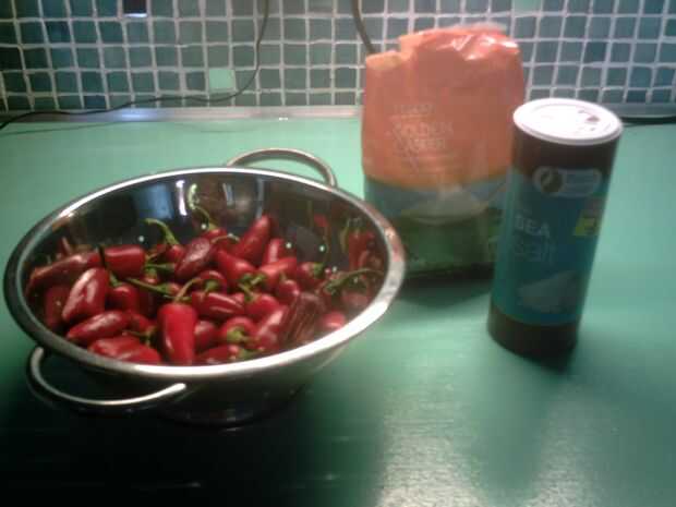 Cantidades iguales de sal y azúcar (la cantidad que usted necesita depende de la cantidad de chiles que tienes)