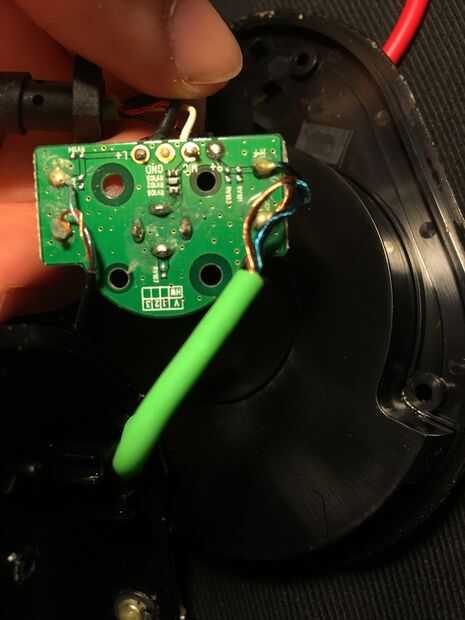 En la imagen adjunta, en el centro de la viruta puede ver 4 pines desde el puerto del micrófono. Vamos a utilizar para conectar los altavoces a él. La izquierda y derecha del pin son ambos a tierra. Tienes que soldar los cables de color cobre en ellos. El orden no importa e incluso puede conectar ambos cables de cobre a la misma si desea hacerlo. El perno superior se utiliza para el cable de color de la bocina izquierda (cable negro delgado), mientras que la espiga inferior es el cable para el altavoz derecho (verde cable grueso).
