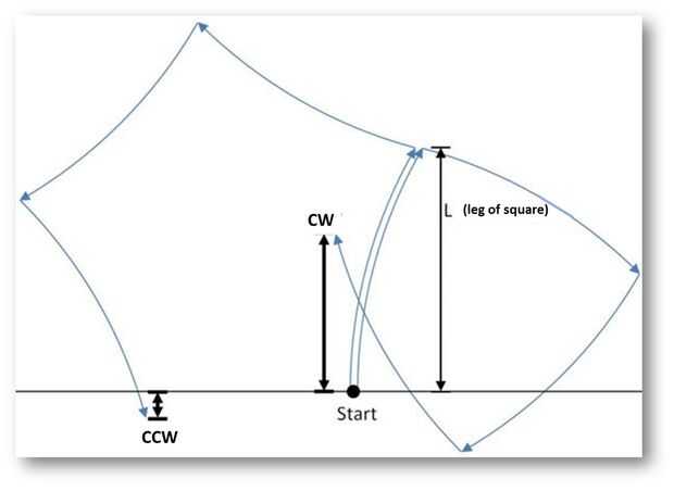 En Resumen Este método trata de abajo: ejecutar un cuadrado hacia la derecha y luego ejecutar la misma Plaza hacia la izquierda. La imagen de abajo muestra una acentuada proyección de la trayectoria real. CW y CCW son los errores que pueden ser medidos después de ejecutar una plaza. El error de ángulo puede calcularse como: