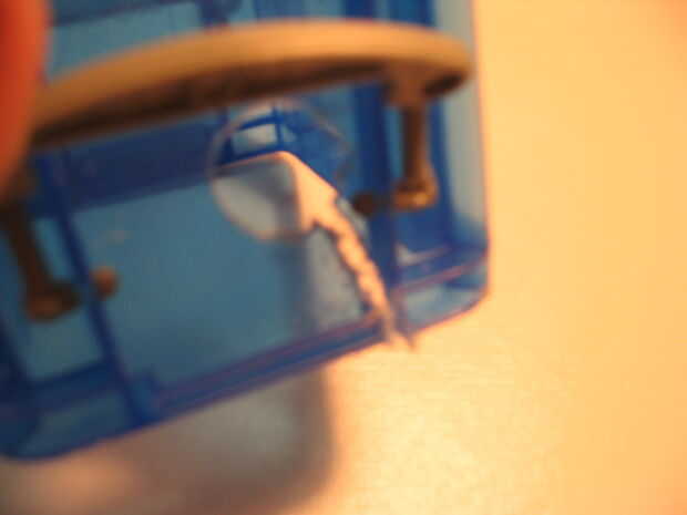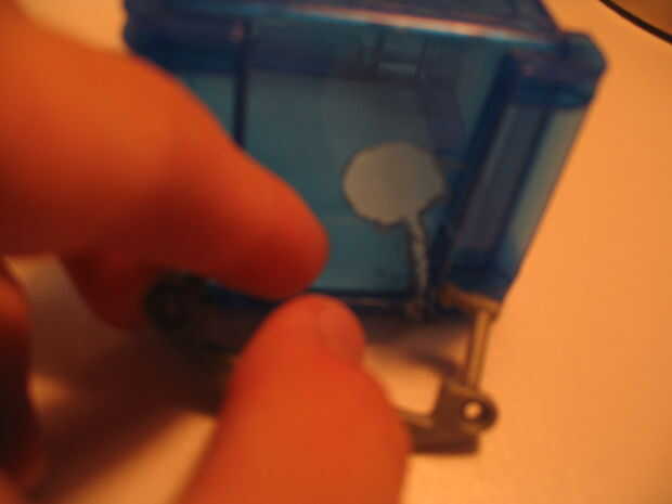 En primer lugar, perfore un agujero en la tapa lo suficientemente grande como para caber el enchufe del motor a través de. Este lado de la tapa será la parte de atrás. Mira las fotos porque ayudan mucho con explicar las instrucciones. No pegue nada todavía.