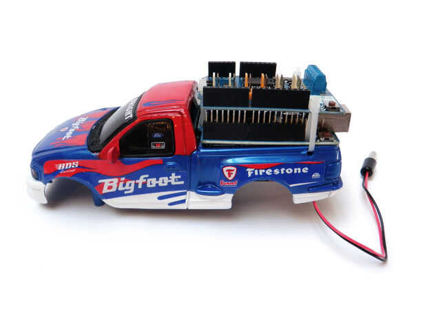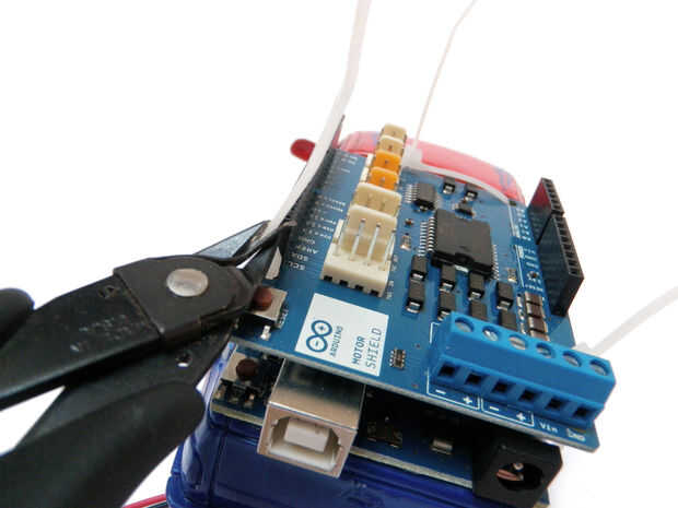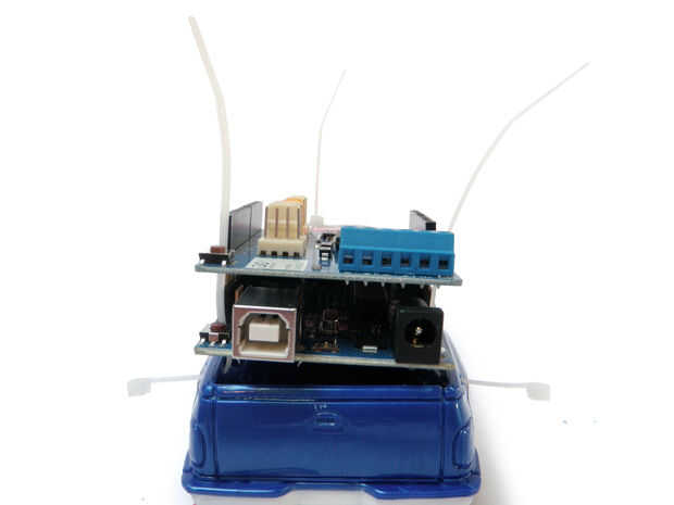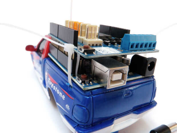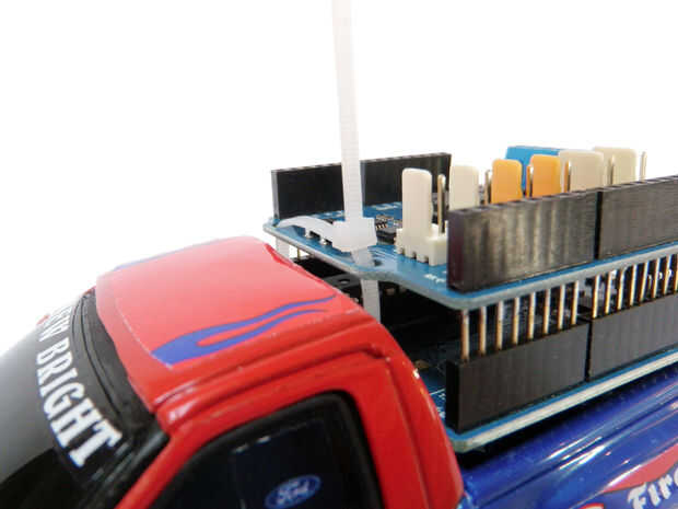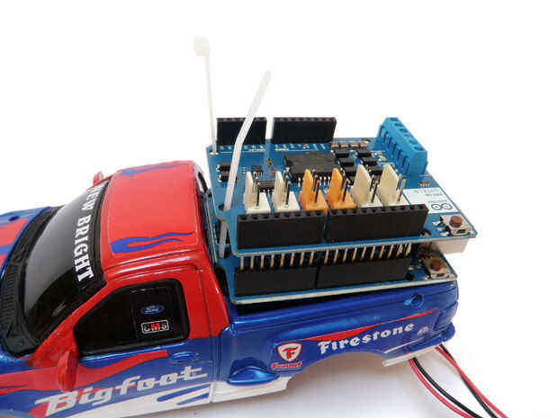 Ahora que se une el escudo del Motor zip empate el Arduino a la parte posterior del coche RC.