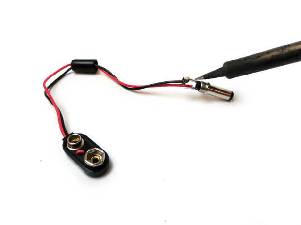 Suelde el cable rojo a la ficha de conexión media soldadura el cable negro a la pestaña de conexión externa.