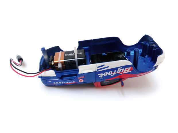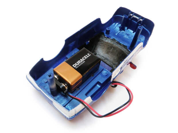 Conecte el clip de 9V a la batería de 9V y zip atarlo en la parte inferior del coche RC.