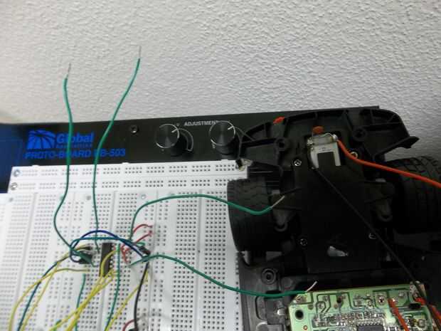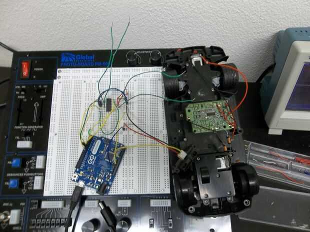Dos motores de conducción no es diferente de una conducción. Su mismo tratar ya que el chip del puente H es simétrico. Para el sistema de antichoque usted realmente sólo necesita controlar el motor delantero/al revés pero al conectar el segundo motor le puede programar el coche por sí mismo (por ejemplo, no figura ochos, tenemos especie de un modo autónomo como un Roomba, etc..). Soldar los cables en mi coche no fueron los mejores por lo que decidí controlar ambos motores con Arduino.