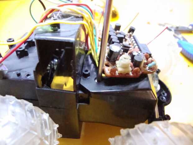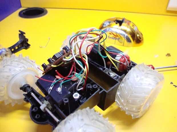 Después de quitar la cubierta Desenroscar el chip del cuerpo y abrir el cuerpo principal del vehículo. Al abrir, encontrará los principales entresijos del coche rc. Si observas con cuidado, usted podrá comprender fácilmente el funcionamiento del coche.