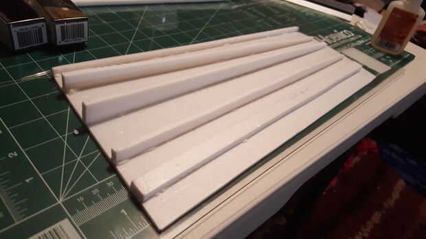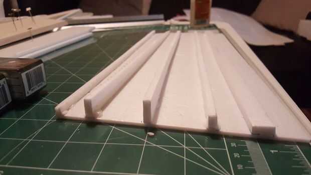 Las costillas y las paredes laterales son bastante sencillos, pero una vez más, el limpio, de 90 grados, cortes hacen la Asamblea fácil y preciso. El pegamento de la superficie y las piezas requieren menos lijado para salir imperfecciones (3mm es muy fina!) Cinta adhesiva mantiene las costillas en su lugar y uno a la vez añadir el lugar y el pegamento del gorila. Utilicé alfileres para sostenerlos en lugar así. Deje que las secciones antes de hacer las última costillas pocos cerca de la parte posterior del avión ya que tendrán que establecerse con la cola y el timón en lugar.