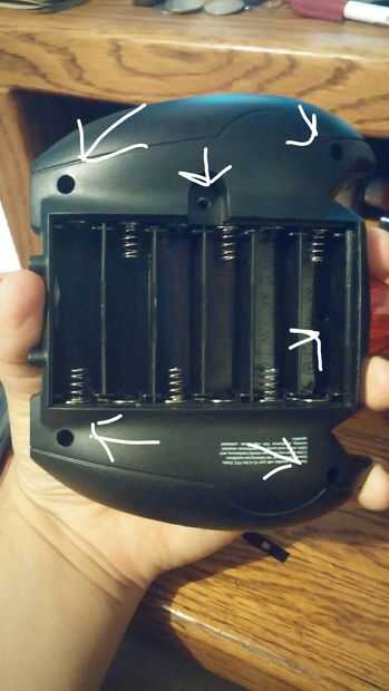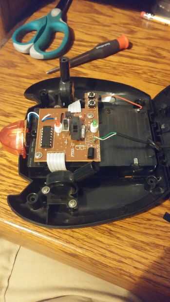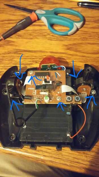 A continuación, una foto del interior. Tiene algunas cosas aseadas, de leds infrarrojos para potenciómetros. Un pequeño negro cable de carga sale de la parte superior del controlador, así que tuve cortar.