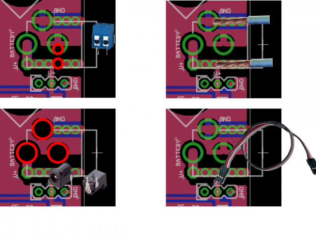 Importante: Si selecciona V-RC con SJ15 (para usar la misma tensión que utilizan las entradas RC) y seleccionó 3V3 con SJ3, entonces no debe utilizar SJ17 para seleccionar nada. Ello hará que la fuente de 5V para unirse con la fuente de 3c3, que puede causar daño a los dispositivos de 3V3.