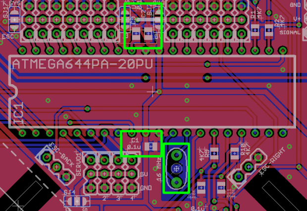 Debe soldar C1 y C2, que son de 0,1 uF condensadores de desacoplamiento para la ATmega644PA. También la soldadura C9 que es un 0.1 uF desemparejamiento del condensador para la referencia analógica.