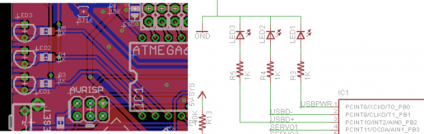 LED1, LED2, LED3 son LEDs de 3 mm, elegir sus propios colores. Puede montarse vertical u horizontalmente (señalando). Por favor observe la polaridad indicada por la forma del agujero y serigrafía. R3, R4 y R5, son todos 1 K resistencias de ohm para limitar la corriente a estos LEDs.
