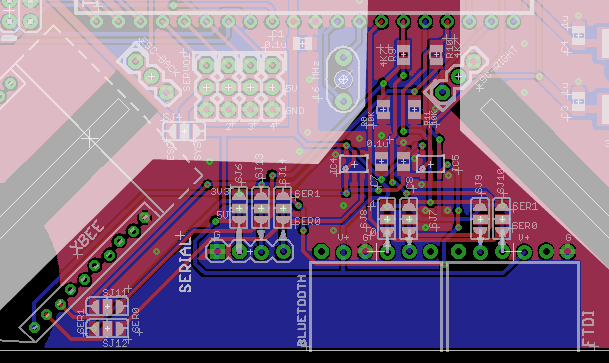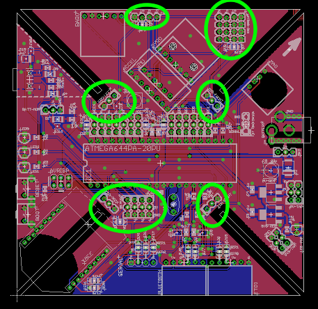 Hay unos dispositivos de puerto serie posible. El ATmega644PA tiene dos puertos serie, USART0 y USART1, se etiquetan SER0 y Pitx1 en el PCB.