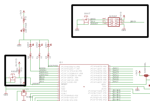 Un botón etiquetado "Bota" puede instalarse sólo si está utilizando un bootloader de Arduino-estándar. Personalmente odio el funcionamiento de bootloaders "sensible al tiempo". Este botón está activo baja y conectado a PB6 en el ATmega. Asegúrese de habilitar las resistencias pull-up internas para este botón.