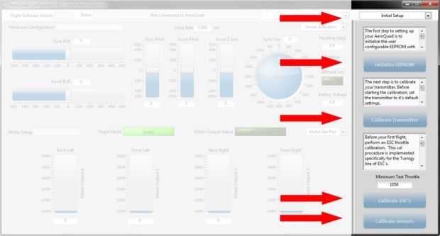 Calibrar los CES siguiendo las instrucciones en el configurador (básicamente el poder de los CES, haga clic en aceptar un botón en la pantalla, potencia en los CES, clic en otro OK). Usted puede a continuación, asegúrese de que los motores de giro en la dirección correcta (hacerlo sin las hélices por razones de seguridad)