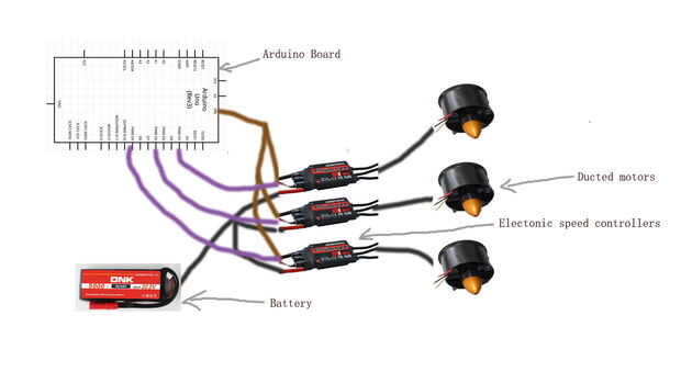 • en la práctica, motor y ESC están conectados directamente a Arduino, ninguna placa o circuito es necesario. Se ponen en la imagen para una mejor comprensión de los cables.