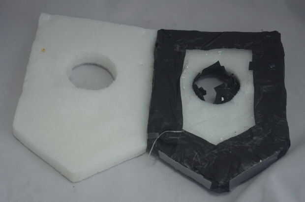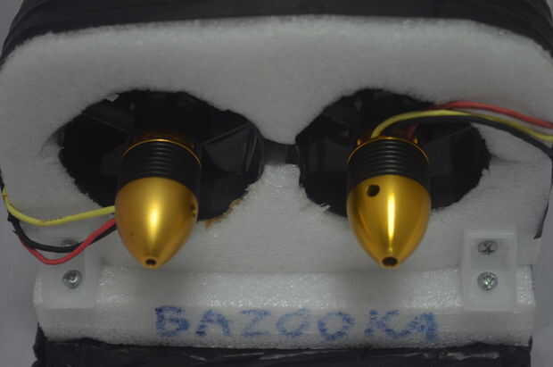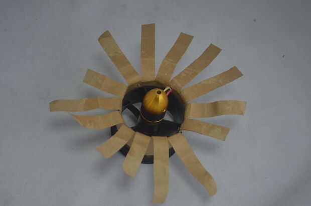 - Parte media es la principal plataforma con toda la electrónica. Tiene básicamente el mismo tamaño y recorte como la parte inferior. Teniendo en cuenta la potencia del motor, sería una buena idea para llegar a una estructura que se acopla el motor de la bomba más firmemente en el agujero en el medio. Así que nos están tomando Kraftpaper (un papel muy duradero), enrollado alrededor del motor y separado del resto como un pedal de flor. Coloque los "pedales" en el cuerpo principal y somos buenos ir. La imagen se explica.