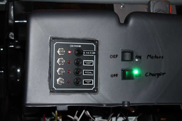El cargador de baterías se empalma en las líneas principales de la batería. Positivo para el cargador fue dividida y ejecutar a uno de los interruptores que compactarse fuera de la caja del desplazador. Esta forma cuando no esté en uso, puede desactivarse y evitará la batería bajando por la espalda en el cargador. Con el cargador incorporado, esto permitirá un cargo cuando sea necesario. El segundo interruptor de la palanca de cambios fue utilizado para encender y apagar los motores y ESC. Será apagado cuando carga para no poder nunca llegar a los motores o el ESC mientras la batería se está cargando. Esto hace que para un simple proceso de carga. No hay cables para quitar ni pilas para sacar. Basta girar el sistema con el interruptor, apagar el cargador enciende y enchufe el cargador. He añadido algunos LED verde al lado de los interruptores que enciendan con los interruptores como luces indicadoras.