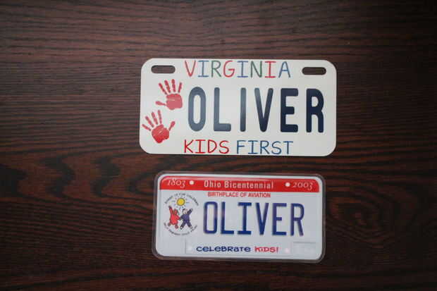 La placa fue ordenada desde un sitio llamado Minipl8s. Tienen un montón de tamaños y diseños de placa, personalizado para cada Estado y que se remonta más de 30 años para los estilos de placas. Elegí la placa de Ohio, que es donde pensaba a Oliver vidas, y lo niños primer diseño que encaja mejor con un vehículo de los niños. Es una placa impresa sobre un papel grueso y laminado. Viene con la parte posterior adhesiva Velcro para montarlo.