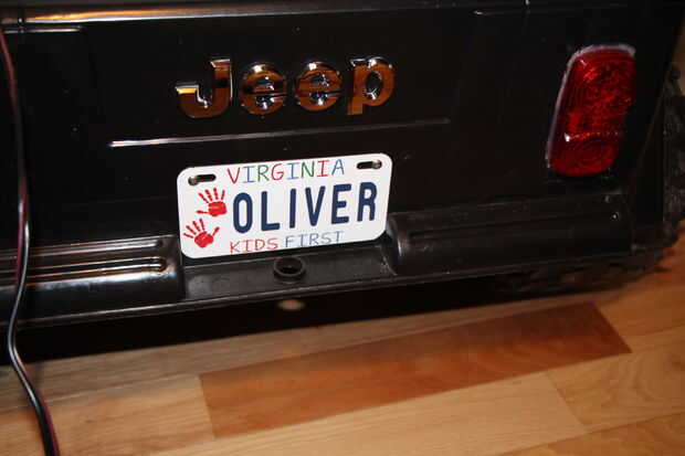 Después de ordenar la matrícula, me enteré de que Oliver no vivo en Ohio cerca de sus padres gran. Vive en Virginia. Mi error. Necesitaba una nueva placa. El foro de ModifiedPowerWheels tiene un miembro que imprime placas personalizadas en aluminio para sobre el mismo precio que el MiniPl8s. Tiene para el diseño de las placas o le puede obtener su gráfica. No son totalmente exactas a las placas del estado pero lo suficientemente cerca que me ha gustado el resultado. Las placas nuevas son ligeramente más grandes y fueron planeadas para ir de frente y la parte trasera del jeep de Oliver. La placa delantera solo encajaba justo entre las luces por lo que le estoy dando a Oliver poner en su silla de ruedas en lugar de otro.