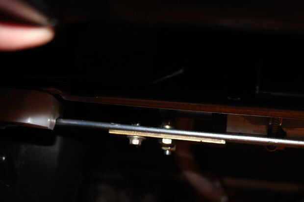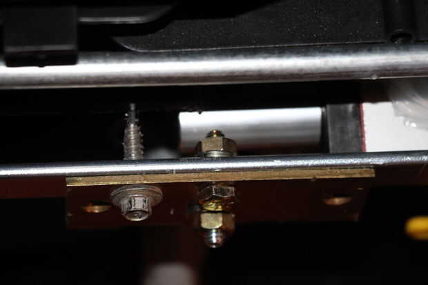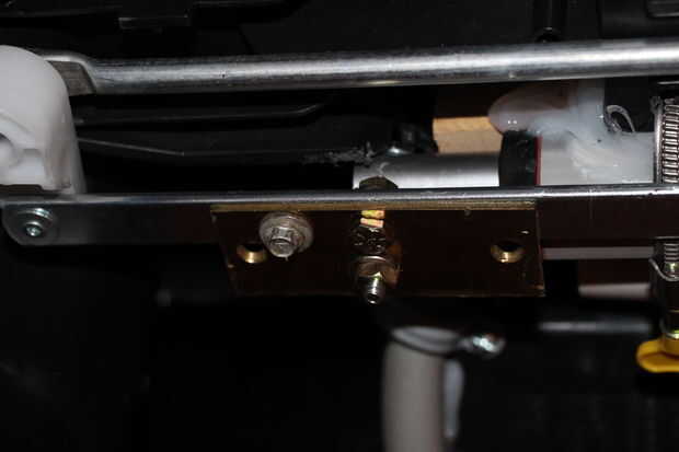 Corté una bisagra de la puerta en la mitad con la herramienta dremel. Enderezado hacia arriba el cilindro de abajo, quitando el ángulo de antes y averiguado dónde perforar un orificio de compensación en la bisagra. Utilicé una tuerca grado 5 desde el actuador hasta la bisagra, y un grado 8 tornillo a través de la barra de dirección/bisagra. Todo grado 8 tuercas / arandelas de bloqueo se utilizaron para conectar todos juntos. La bisagra quería girar un poco con el esfuerzo de torsión así que añadido un metal tornillo autorroscante a través de la barra de bisagra para asegurar en su lugar y llevarse el giro. El tornillo se corta al ras con la parte de atrás de la barra con una dremel cortar la rueda para asegurarse de que no coger nada por debajo.