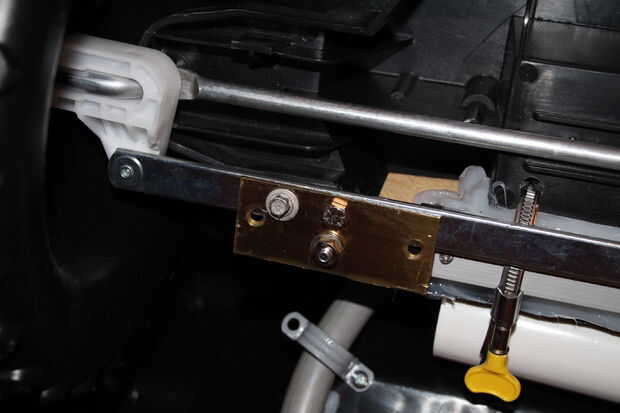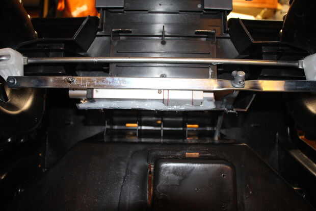 El actuador debe montarse en algún lugar alrededor de las ruedas delanteras para empujar y tirar de la dirección de la barra que a su vez se mueve la dirección de las ruedas. I cortar unos soportes de la lengüeta de plástico y montar el actuador bajo la barra de dirección. Antes de la colocación en el actuador fue perforado un agujero de 3/4 de pulgada donde los cables de alimentación la parte de atrás del actuador y en el compartimiento anterior.