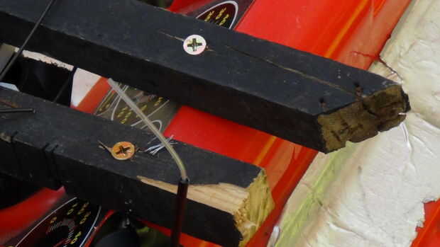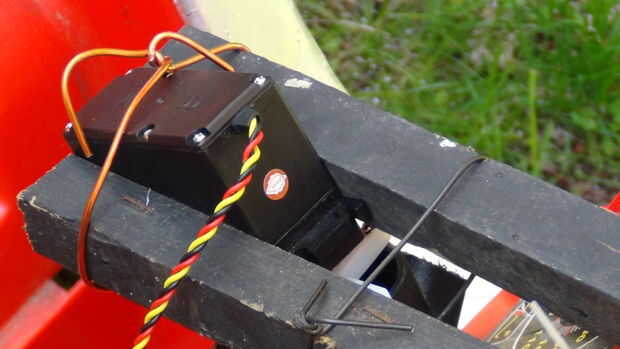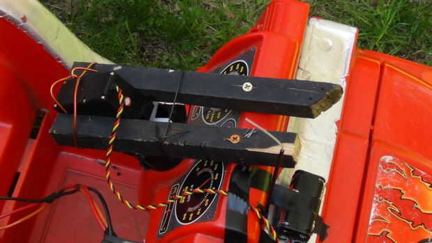 2. para colocar el servo dirección, utilice los tornillos incluidos y el tornillo a través de los agujeros y en el borde de la dirección de la rueda (ver foto). Utilizar dos trozos de madera y tornillo en el tablero, asegurándose de que alinee con el servo. Utilizar dos trozos gruesos de alambre para garantizar al servo.