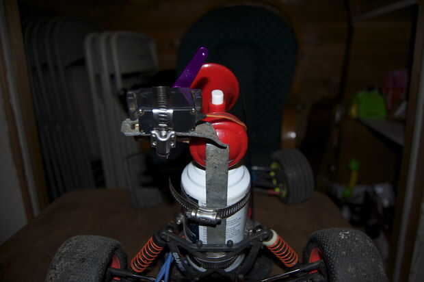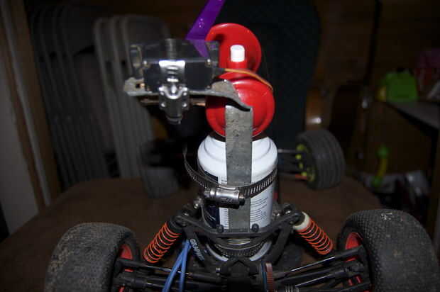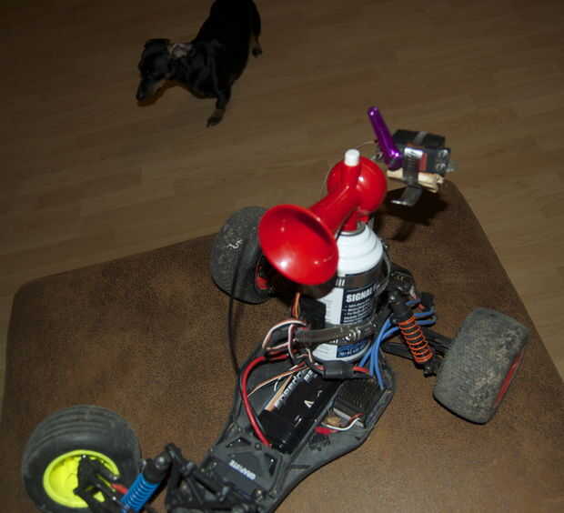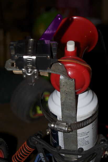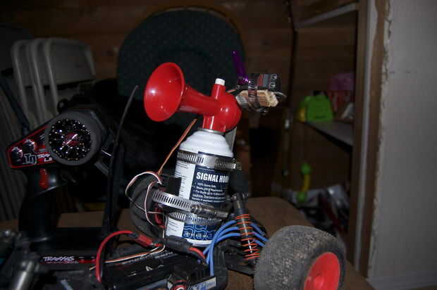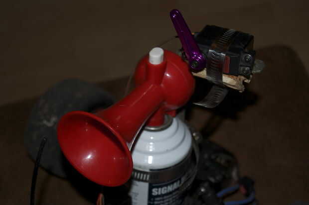 Utilicé una pieza de metal galvanizado que se utiliza para la cadena de acoplamiento de cerca. Doblado para hacer un soporte para el motor servo que se utiliza para presionar el pistón de bocina de aire. Abrazaderas de manguera se utilizaron para el montaje y montar el cuerno/servo para el coche. Voy a publicar vídeo cuando me levanto. Planeo mi cámara de video inalámbrica que de montaje y funcionamiento de mi coche y grabación todo estilo "primera persona".