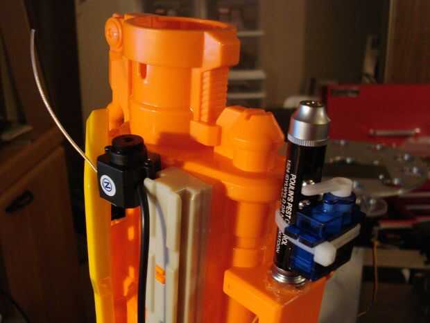 Recibí el puntero láser de un lugar de control de plagas locales como una cosa del tipo de regalo. Yo estaba teniendo una diablos de un tiempo tratando de montarlo y estoy bastante disgustado con el resultado final, aunque funciona de forma fiable. Yo simplemente cable atado un mini servo para empujar hacia abajo el botón láser. El laser tiene un imán integrado en la base de la misma, tan sólo pegué otro imán en la parte delantera de la pistola para montarlos juntos. Voy a tener que idear un método de montaje mejorado para la próxima versión.