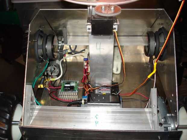 Aquí es una instantánea de los interiores, su prettystraight hacia adelante y un poco desordenado ya que la mayoría de los cables extra largas por si acaso. Tuve que prolongar los cables servo las armas así que fui a la tienda de hobby local y compró un pequeño rollo de cable de servo de 3 conductores y empalmar el cable existente.