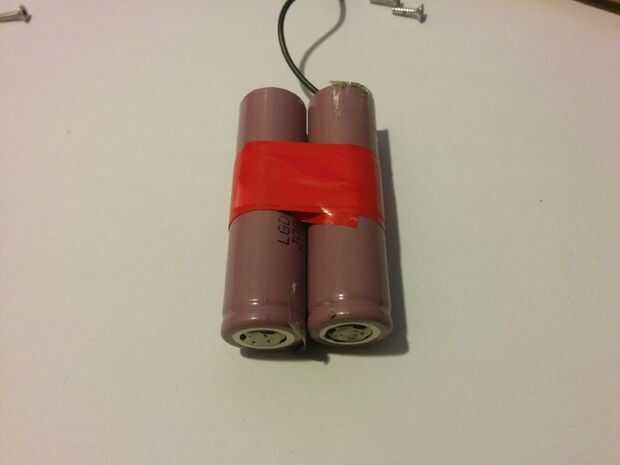 soldar un pequeño trozo de cable entre los terminales en el lado negativo y positivo, tratar de no sobrecalentar la batería en sí. Utilice las fichas existentes, hacen mucho más fácil y más planas. Básicamente lo queremos conseguir es una célula sub plana de 18650 de 2 células, que pueden caber en el viejo plástico de la batería con facilidad, sin cortocircuito a nada...