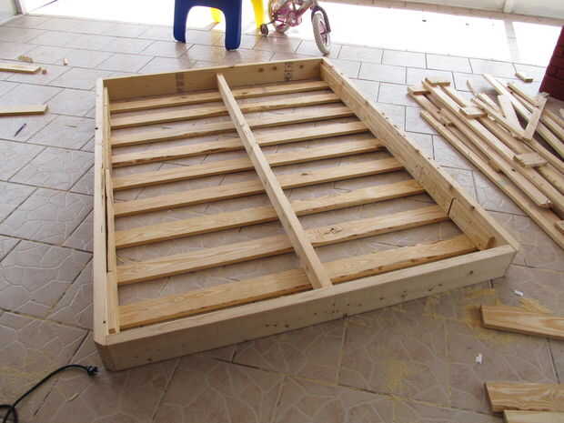 Para mantener la parte inferior de inclinación hacia fuera, agregué 3 listones en la parte inferior. A velocidad por precisión, se colocaron 20, 40 y 60 pulgadas de un lado. Igual que en el lado del colchón: Pretaladre para 2 tornillos a cada lado, luego hacer las medianas pre-perforaciones y fijaciones.