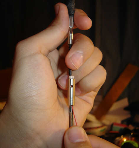 Coge el barril, el cable a través del hilo de rosca que se pega hacia fuera el extremo estrecho del cañón, con la tapa que sobresale hacia el extremo más ancho. Tire del cable a través de hasta que la tapa es una pulgada o tan de la barrica y atornille el barril hasta el punto de la hoja. Asegúrese de que el cable en la ranura de la cuchilla, puede moverse libremente y no quedar atrapado en los hilos de la hoja/barril.