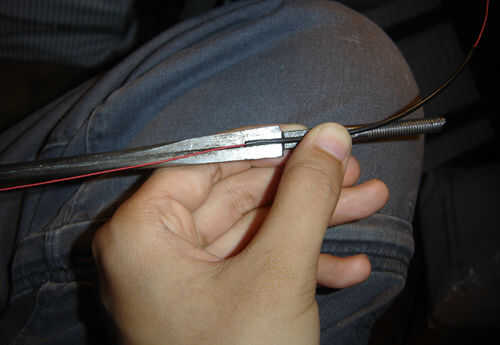 Una sección de espagueti del hilo de rosca (3-5" es buena) sobre la tapa de no terminar y deslice hacia arriba para que se repose aproximadamente donde la ranura de la cuchilla termina, justo en el cruce del fuerte de la hoja y la espiga. Generalmente uso un poco de cinta adhesiva para asegurar los espaguetis en este lugar, mientras permite que el alambre se deslice cuando sea necesario.
