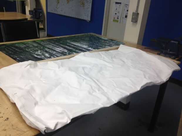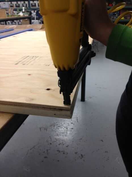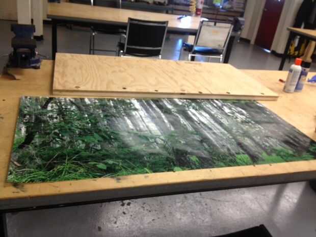 Una vez que el lienzo está apagado, se expone el marco. Quería que la imagen a una buena distancia fuera de la pared. Para lograr esto corta una hoja de madera contrachapada de 3/4' a brad a la parte superior del marco. Esto no sólo me dio la altura que quería pero también suministrar una superficie lisa de realativly para adherir la imagen a. Para montar la madera contrachapada a la Junta usé una pistola neumática brad y poner varios clavos a lo largo de la parimeter de la estructura, así como por la mitad.