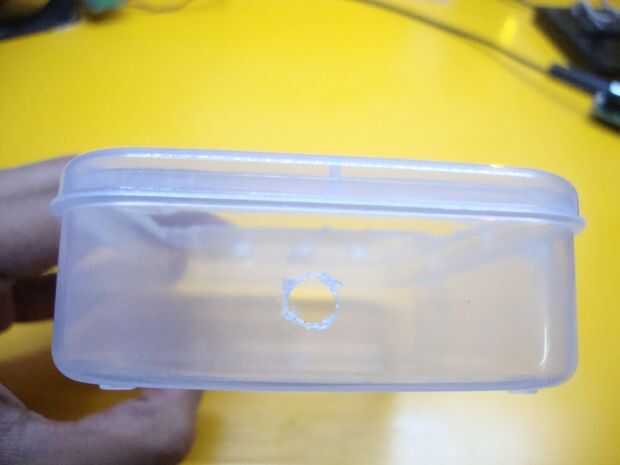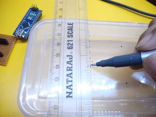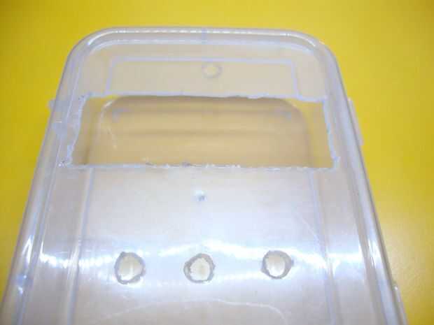Utilizando la pantalla de cristal líquido, marque en la parte superior del gabinete que debe ser el tamaño de la pantalla LCD. Luego marque tres agujeros para un led justo debajo de la pantalla LCD. Marque dos orificios más para el interruptor y conector hembra. Los agujeros deben ser un poco más pequeños que el tamaño original para que todas las piezas encajen firmemente. Utilizar las imágenes por encima de referencia.