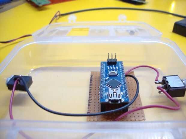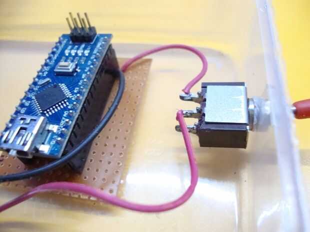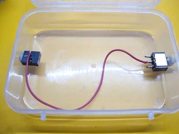 Añadir el interruptor y el conector hembra en los agujeros realizados anteriormente. Ahora Conecte el positivo (cable rojo) del gato a una terminal del interruptor y el negativo (cable negro) al pin GND de arduino. Luego conecte la otra terminal del interruptor al pin Vin de arduino. Esto hace que la configuración que se potencia el arduino cuando el interruptor está cerrado (ON).