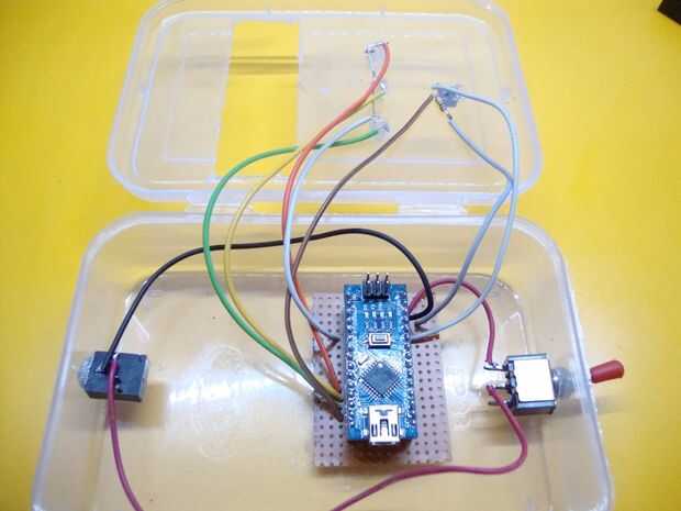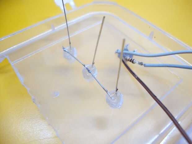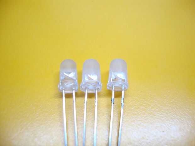 Fijar el led en el primer agujero, amarillo en el segundo agujero y verde en el tercero rojo. Ahora conectan todos los terminales negativos y un trozo de alambre para la soldadura. Tres más cables a los terminales positivos de todos los leds de la soldadura. La razón de por qué no añadir resistencias limitantes actuales como el brillo se reduce notablemente. Usted puede Agregar pero todavía funciona sin él. Ver esquema de arriba para las conexiones.