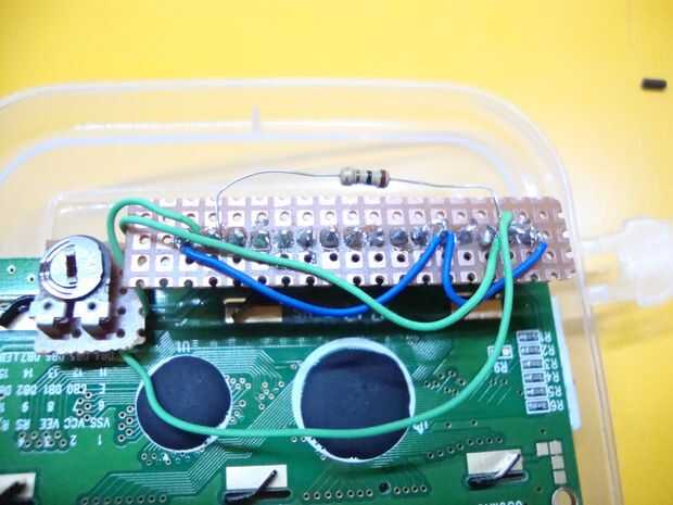 Fijar la pantalla LCD en su lugar con cinta de doble cara. Utiliza algunos conectores macho, preparar un zócalo que cabría en la pantalla LCD. Luego conectan pines 1,5,16 . También agregar un resistor de 100 ohmios entre los pines 2 y 15. Esto se utiliza para alimentar el led presente en LCD que actúa como una luz de fondo. Luego añadir un preset con perno superior conectado al pin 3 de la pantalla LCD, pin izquierdo inferior conectado al pin 16 y eje derecho inferior conectado al pin 2. Ver esquema en el paso 8 para referencia.
