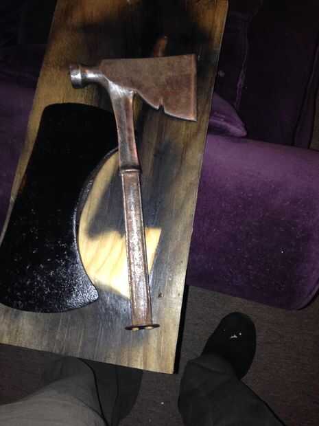 estoy en una producción de Noises Off y uno de los apoyos necesitados es un hacha de bombero. La solución propuesta fue tomar un plástico woods mans hacha del mago de Oz y poner algunos rojo pintura en él. El resultado fue... bueno... pasable tal vez