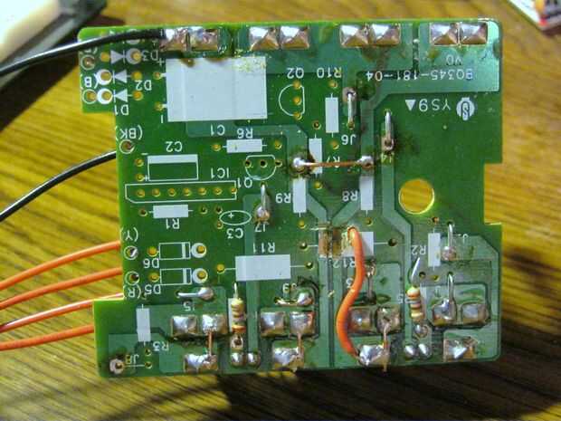 Este cargador Panasonic realmente cargado en pares para que tuvieras que cargar las baterías de dos o cuatro al mismo tiempo. Así que tuve que hacer algunos cortes en el PCB. Luego también tuve que puente los positivos de AA y AAA para cada ranura.