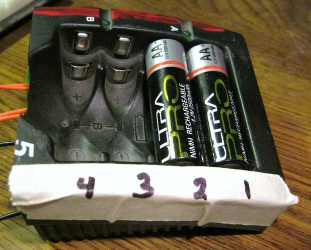 Pero en primer lugar, necesitaba un soporte para pilas AA y AAA. Bueno, no tengo ninguna disponible y no tratar de hacer mi propio (según lo visto en Instructables muchos). Pero tenía un viejo cargador de batería Panasonic que realmente me gustaba (ver consejos de batería recargable). Éste llevará a pilas AA o AAA.